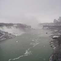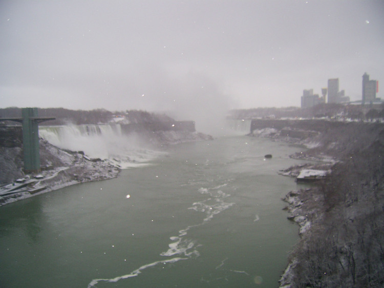 - en-CA Weather conditions in Niagara Falls when the photo was taken: Wind:west, 15 km Temp: -2° C Overcast, light snow Time: 8:28 a.m. This photo from Rainbow bridge, where concrete meets steel part of bridge.