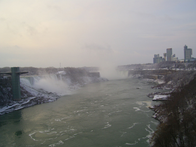 - en-CA Weather conditions in Niagara Falls when the photo was taken: Wind: west, 19 km, gusts to 28 Temp: -1° C Partly cloudy Time: 8:27 a.m. This photo from Rainbow bridge, where concrete meets steel part of bridge.