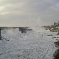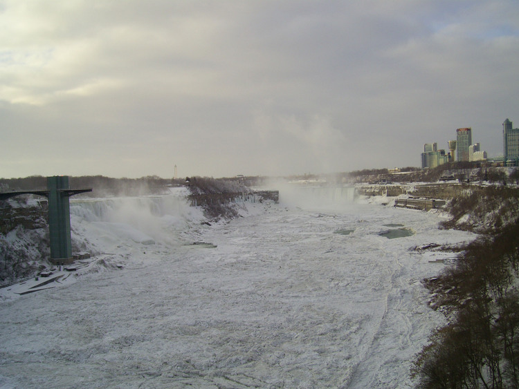 - en-CA Weather conditions in Niagara Falls when the photo was taken: -8º C Cloudy Time: 8:28 a.m. Wind west, 28 km, gusts to 41 This photo from Rainbow bridge, where concrete meets steel part of bridge.