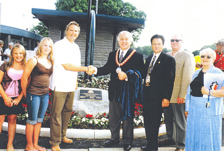 - R-L: Paisley Janvary Pool, Rick Johnson Parliamentary Assistant for Rob Nicholson, M.P., MPP Kim Craitor, Mayor Ted Salci, Philip Oakes grandson of Sir Harry Oakes with his two daughters Hunter (far left) and Kirsten (beside her father) ;