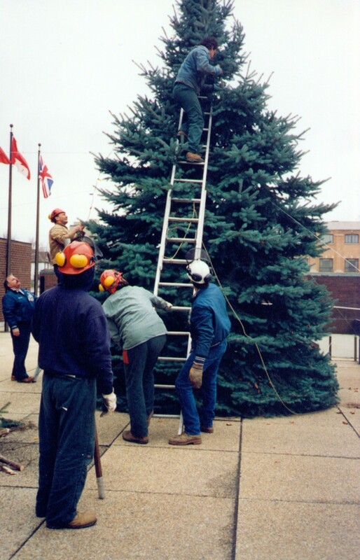 City of Niagara Falls workers installing a Christmas Tree in Centennial Square