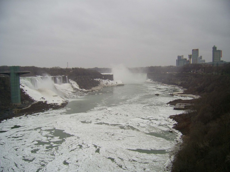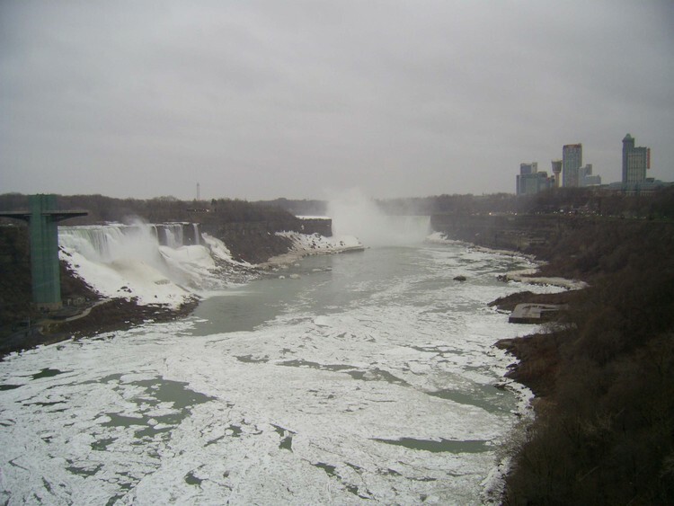 - en-CA Weather conditions in Niagara Falls when the photo was taken: 0º C Light drizzle Time: 8:23 a.m. Wind southwest, 27 km, gusts to 52 km This photo from Rainbow bridge, where concrete meets steel part of bridge.