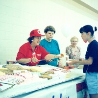 - Frances Corfield (in red) serving birthday cake at the Canada Day celebrations in Niagara Falls