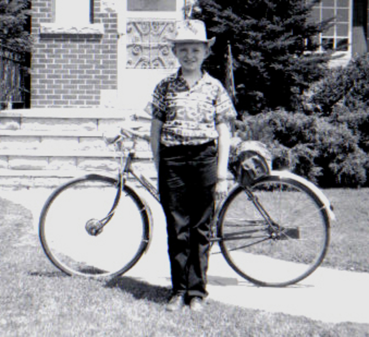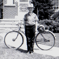 - Ron Clatworthy and his bicycle in front of 2873 Barker Street
