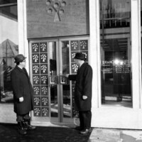 Unidentified men at the front doors of Lincoln Trust located on Queen Street.