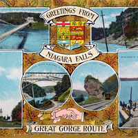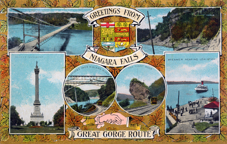 - Top Row L-R: Suspension Bridge, Niagara Gorge Bottom Row L-R: Brock's Monument, Cantilever and Lower Arch Bridges, The Great Rock in the Niagara Gorge, Steamer nearing Lewiston