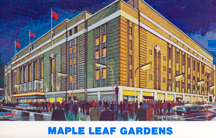 - en-CA Reverse reads "Maple Leaf Gardens home of the Toronto Maple Leaf Hockey Club ; The Gardens opened in 1931 - capacity of 16,485 for hockey. It plays host to a variety of entertainment which includes hockey, wrestling, boxing, rock shows, basketball as well as internationally famous ice shows, ballets and conventions" ;