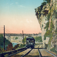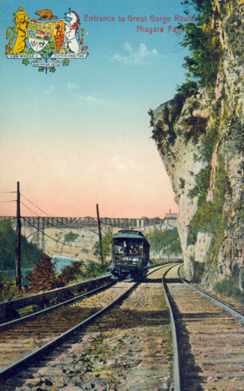 - Cantilever Whirlpool Bridge in background ; railway car of the Great Gorge Trip on tracks ;