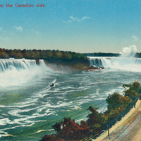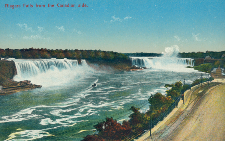 - L-R: American Falls ; Horseshoe Falls, Table Rock house ; note tram tracks through Queen Victoria Park