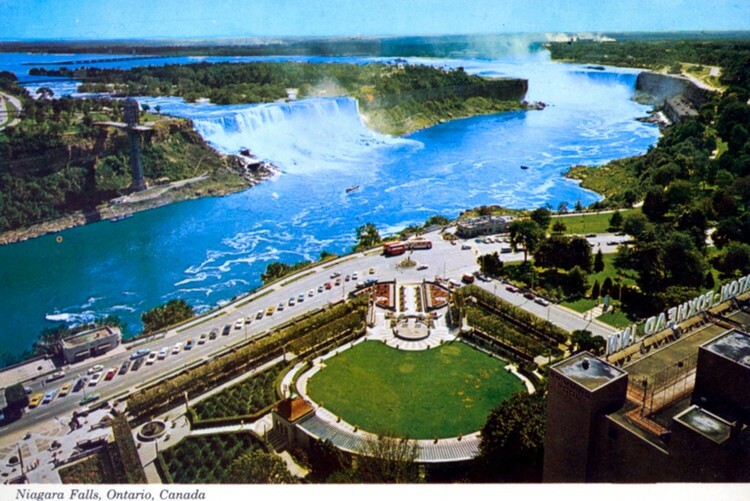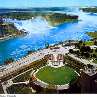 - Horseshoe and American Falls in background, Niagara Parkway L-R (centre), Oakes Garden Theatre (centre), Sheraton Fox Head Hotel (bottom right) ;