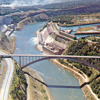 - en-CA Aerial view of the Lewiston-Queenston Bridge. The largest hinged arch bridge in the world with an arch of 1,000 feet. In the background can be seen the Sir Adam Beck and Queenston Hydro projects