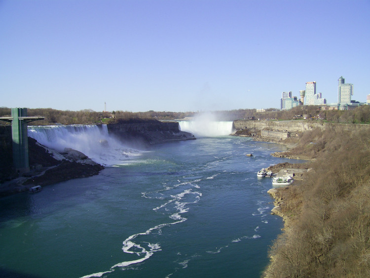 - en-CA Weather conditions in Niagara Falls when the photo was taken: 8º C Sunny Time: 8:16 a.m. Wind north north east, 7 km hour This photo from Rainbow bridge, where concrete meets steel part of bridge.