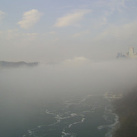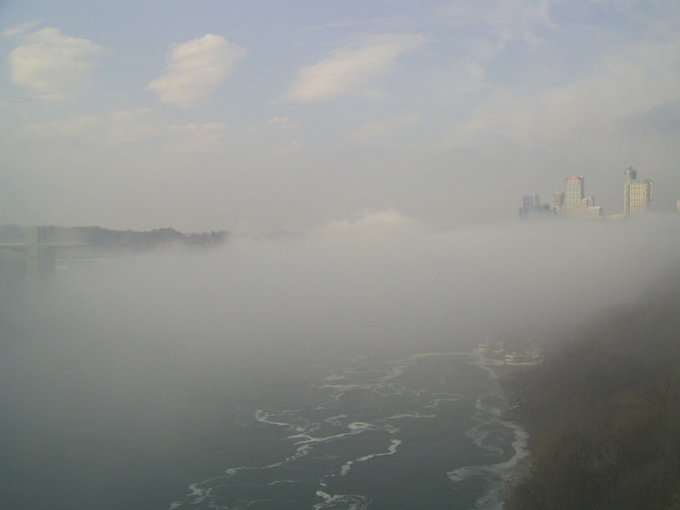 - en-CA Weather conditions in Niagara Falls when the photo was taken: 14º C Foggy Time: 8:23 a.m. Wind west, 2 km hour This photo from Rainbow bridge, where concrete meets steel part of bridge.
