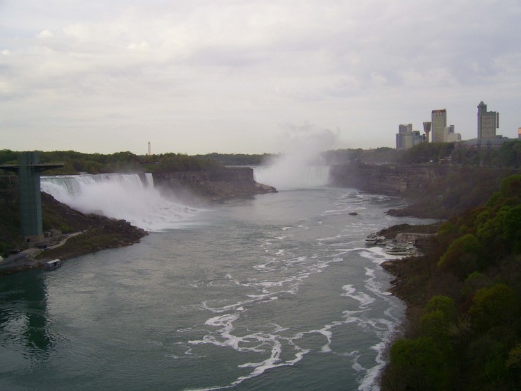 - en-CA Weather conditions in Niagara Falls when the photo was taken: 11º C Cloudy Time: 8:21 a.m. Wind east north east, 6 km hour This photo from Rainbow bridge, where concrete meets steel part of bridge.
