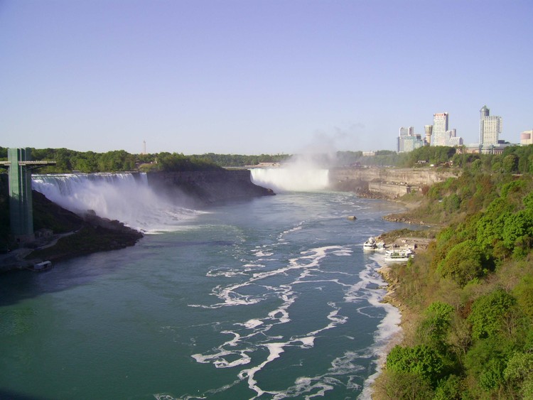 - en-CA Weather conditions in Niagara Falls when the photo was taken: 13º C Sunny Time: 8:13 a.m. Wind east north east, 11 km hour This photo from Rainbow bridge, where concrete meets steel part of bridge.