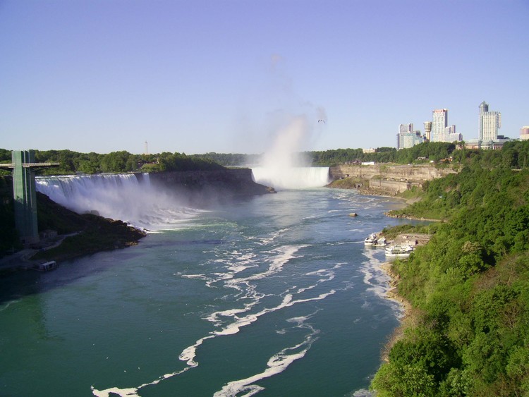 - en-CA Weather conditions in Niagara Falls when the photo was taken: 13º C Sunny Time: 8:18 a.m. Wind west north west, 13 km hour This photo from Rainbow bridge, where concrete meets steel part of bridge.