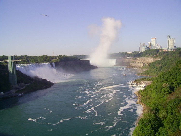 - en-CA Weather conditions in Niagara Falls when the photo was taken: 12º C Sunny Time: 8:09 a.m. Wind east north east, 5 km hour This photo from Rainbow bridge, where concrete meets steel part of bridge.