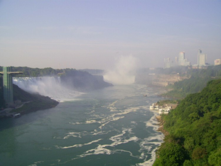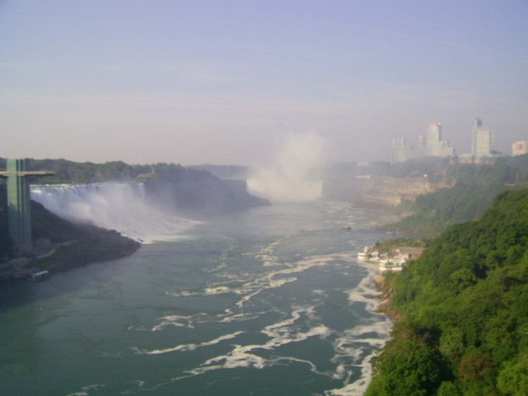 - en-CA Weather conditions in Niagara Falls when the photo was taken: 23º C Hazy Time: 8:17 a.m. Wind south, 11 km hour This photo from Rainbow bridge, where concrete meets steel part of bridge.