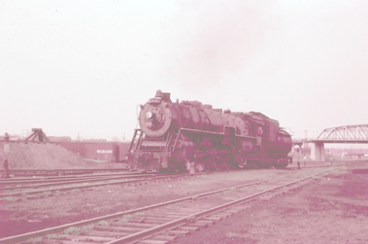 - Train on the tracks near Fort Erie ; storage containers in background read "Wabash" ;