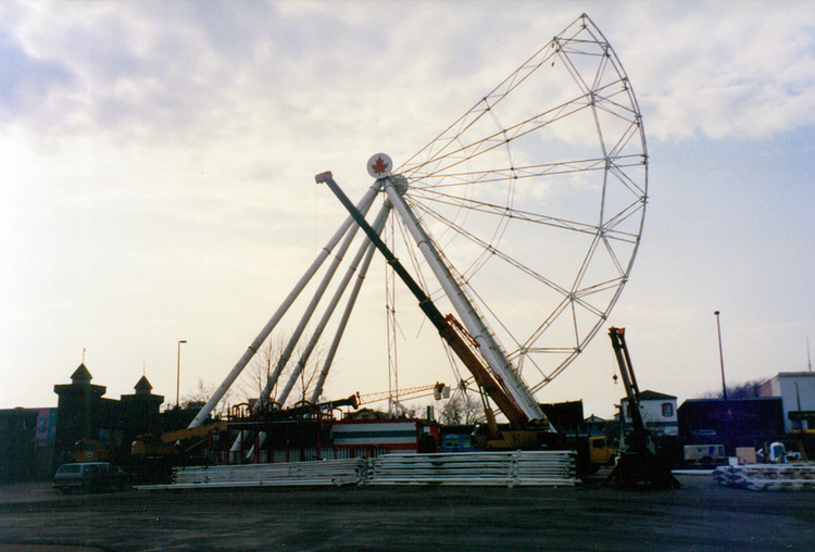 - The ferris wheel at Maple Leaf Village being torn down in the fall/winter of 1992 ; about sixty percent of the wheel has been removed ; heavy construction crane partially visible in background centre right between the steel girders of the wheel ; sign on crane reads "J J Equip" ; man in cherry picker attached to crane (right) ; Maple Leaf Village logo sill attached to pole at top of ferris wheel ; red green and white building in background on Victoria Avenue advertising "Pizzas and Pasta" ; steel girders already removed from wheel piled in foreground of image ; entrance gate towers in background (left) ;