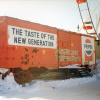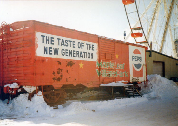 - The railway box car has advertising signs for Maple Leaf Village Park and also for "Pepsi The Taste Of the New Generation" ; ferris wheel and the seats of the cars are partially visibly (top right) ; snow on ground