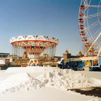 - The Dixie Dangler Swing Ride (centre) ; Canadian Cookhouse (centre right) ; the Giant Wheel (top right) ; turreted towers of the park entrance right of the wheel ; snow on ground ;