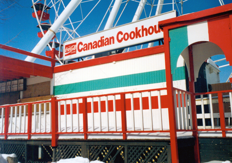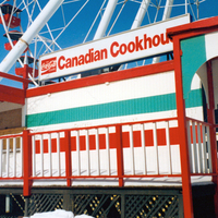 - Wooden structure brightly painted in red, green and white stripes surrounded by a picket fence ; white sign on roof reads "Canadian Cookhouse" and has a Coca-Cola Classic advertising sign in the top left corner ; the tubular steel supports and part of the giant ferris wheel visible in background ; snow on ground ;