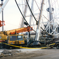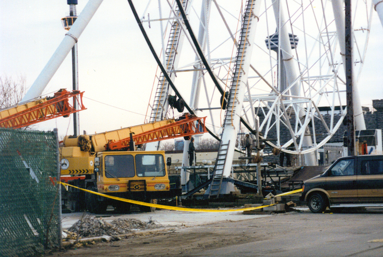 - Heavy construction equipment including cranes (left) ; tubular steel supports of the Giant Ferris Wheel and part of the ride (centre and right) ; van parked (right) ; Skylon Tower partially visible through the base of the ride (top right) ;