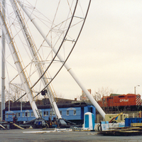 - Tubular steel supports of the Giant Ferris Wheel and part of the ride (centre and left) ; blue box car in background ; CP Rail train passing along the tracks on Victoria Avenue background right ;