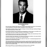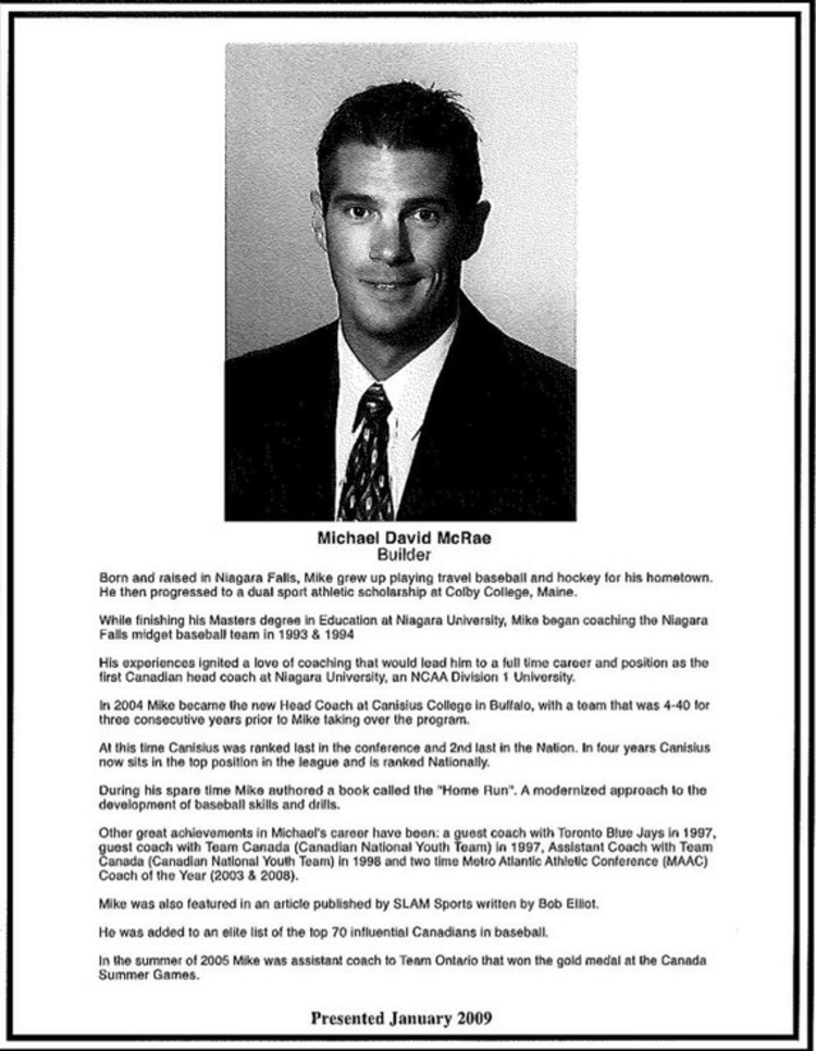 - en-CA Born and raised in Niagara Falls, Mike grew up playing travel baseball and hockey for his hometown. He then progressed to a ual sport athletic scholarship at Colby College, Maine ; While finishing his Masters degree in Education at Niagara University, Mike began coaching the Niagara Falls midget baseball team in 1993 & 1994 ;his experiences ignited a love of coaching that would lead him to a full time career and position as the first Canadian head coach at Niagara University, an NCAA Division 1 University ; In 2004 Mike became the new Head Coach at Canisius College in Buffalo, with a team that was 4-40 for three consecutive years prior to Mike taking over the program. At this time Canisius was ranked last in the conference and 2nd last in the Nation. In four years Canisius now sits in the top position in the league and is ranked Nationally ; During his spare time Mike authored a book called the “Home Run” ; a modernized approach to the development of baseball skills and drills ; Other great achievements in Michael’s career have been: a guest coach with Toronto Blue Jays in 1997, guest coach with Team Canada (Canadian National Youth Team) in 1997, Assistant Coach with Team Canada (Canadian National Youth Team) in 1998 and two time Metro Atlantic Athletic Conference (MAAC) Coach of the Year (2003 & 2008) ; Mike was also featured in an article published by SLAM Sports written by Bob Elliot ; He was added to an elite list of the top 70 influential Canadians in baseball ; In the summer of 2005 Mike was assistant coach to Team Ontario that won the gold medal at the Canada Summer Games ;