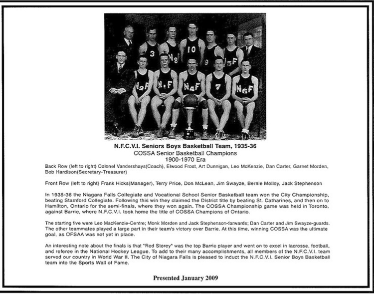 - en-CA In 1935- 36 the Niagara Falls Collegiate and Vocational School Senior Basketball team won the City Championship, beating Stamford Collegiate. Following this win they claimed the District title by beating St. Catharines, and then on to Hamilton, Ontario for the semi-finals, where they won again. The COSSA Championship game was held in Toronto, against Barrie, where N.F.C.V.I. took home the title of COSSA Champions of Ontario ; The starting five were Leo MacKenzie- Centre; Monk Morden and Jack Stephenson- forwards; Dan Carter and Jim Swayze- guards. The other teammates played a large part in their team’s victory over Barrie. At this time, winning COSSA was the ultimate goal, as OFSAA was not yet in place ; An interesting note about the finals is that ‘Red Storey’ was the top Barrie player and went on to excel in lacrosse, football, and referee in the National Hockey League. To add to their many accomplishments, all members of the N.F.C.V.I. team served our country in World War II. ;