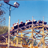 - Close-up view taken from beside the coaster giving a good view of the framework of the ride ; ; one of the coaster cars filled with people is at the top of the ride ; trees at left of the image are just beginning to turn colour ; a light standard centre left ;
