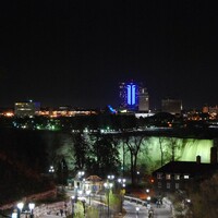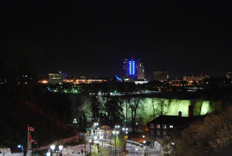 - American Falls illuminated in green at night (bottom right; the skyline of Niagara Falls NY in background ; large tower block in background with blue lights is the Seneca Casino, NY ; the bottom of the image shows the view down Murray Hill, Edgewater's Restaurant bottom right located in Queen Victoria Park ; view taken from the top of Murray Hill 10:02 pm ;