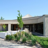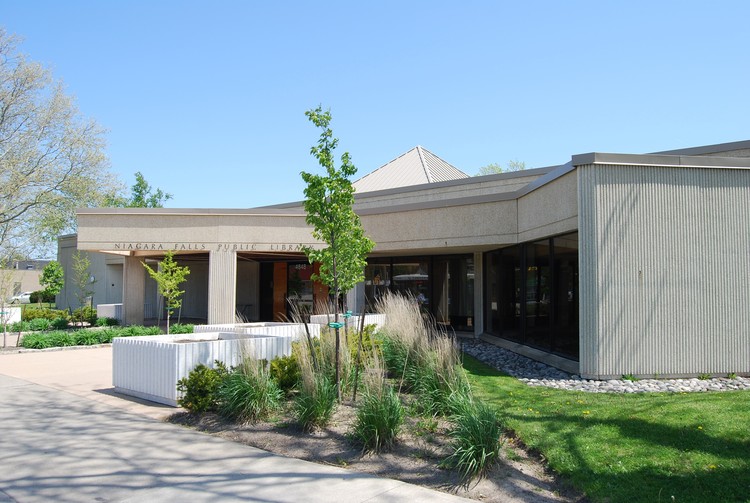 - Single story cement structure surrounded by a pebble berm ; cement planters line the walkway to the main entrance under the canopy (centre) ; two flower beds with trees also line the walkway ; black lettering "Niagara Falls Public Library" runs around the top of the canopy ;