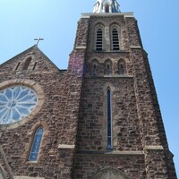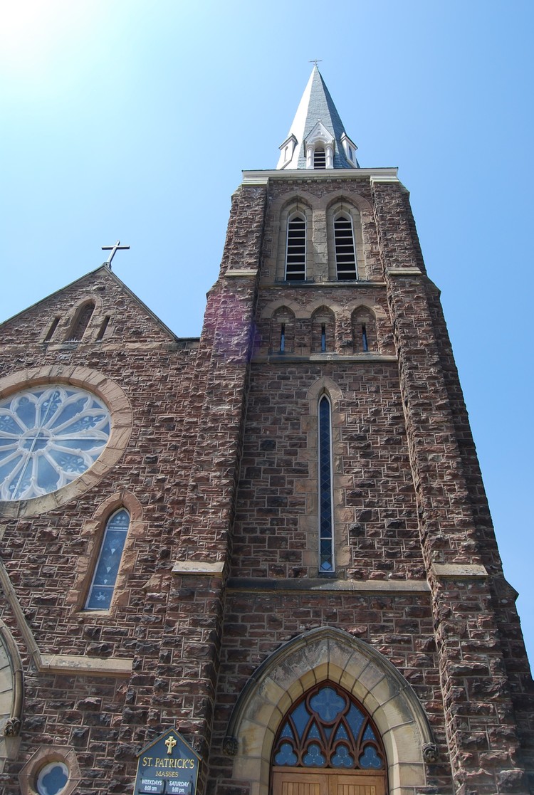 - Brownish stone structure looking up at the church steeple ; stained glass window (left) ; taken at 1:04 pm ;