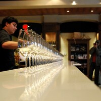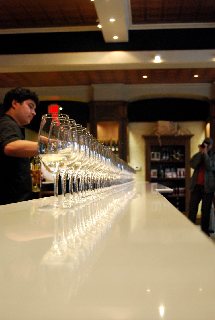 - An employee of the winery is shown placing glasses along the counter in preparation for a wine tasting event ; taken at 6:46 pm ;