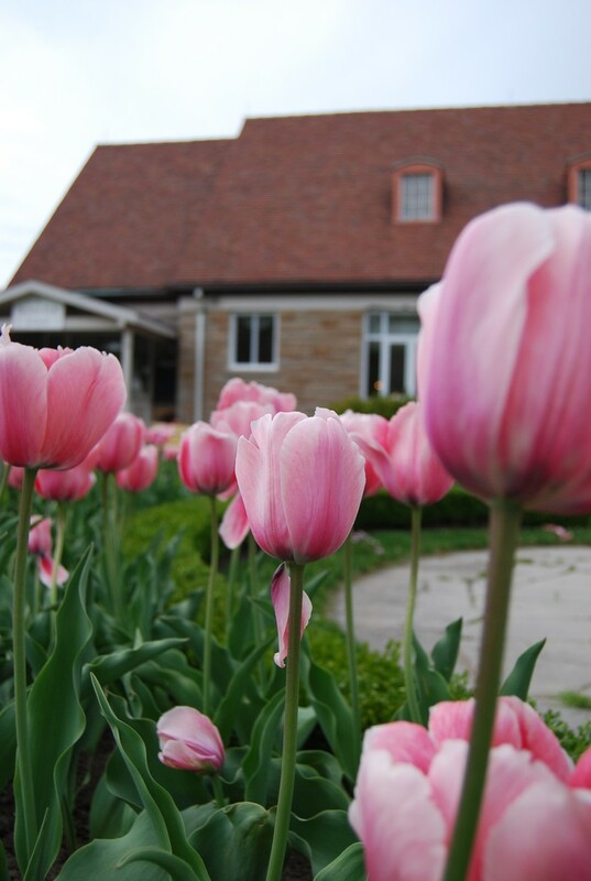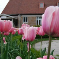 - Flower bed of pink tulips ; restaurant in background ; taken at 7:37 pm