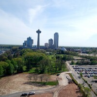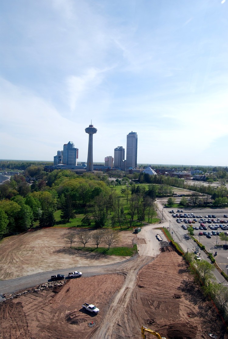 - view from the large ferris wheel (known as the Sky wheel) ; Embassy Suites Hotel next to the Fallsview Casino Complex (left) ; various other hotels scattered along the skyline ; Pyramid Place at base of hotels (right centre) ; Queen Victoria Park lower half of image ; construction site is clearing the way for a new entertainment attraction at location of Quality Inn ; taken 5 pm ;