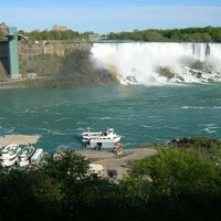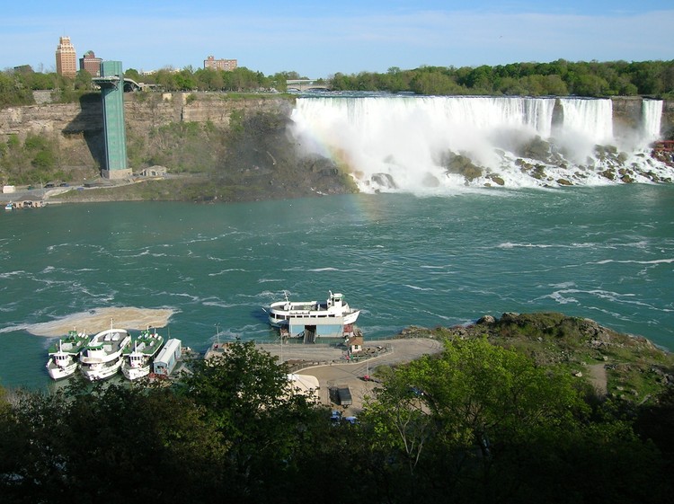 - American Falls (right) ; Prospect Point Observation Tower (left) ; Niagara River in centre of image ; Maid of the Mist boats at the landing dock (lower centre) ; a rainbow through centre of the image ; skyline of Niagara Falls NY in background ; taken 6:11 pm ;