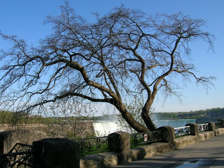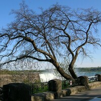 - Stone parapet with black wrought iron railing attached runs through the image; a large tree just begin to bud is in the foreground ; taken 6:31 pm ;
