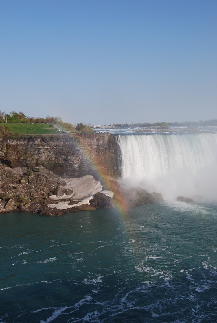 - The Horseshoe Falls are partially visible to the right ; a large rainbow curves through the centre of the image ; a large chunk of ice to the left of the rainbow is a remnant of a very icy winter ; taken 6:28 pm ;