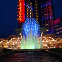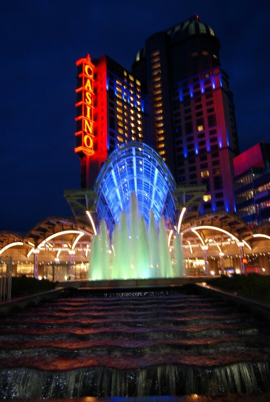 - Night time view of the casino complex fronting on Fallsview Boulevard ; brightly lit fountains in centre of image ; taken 9:18 pm