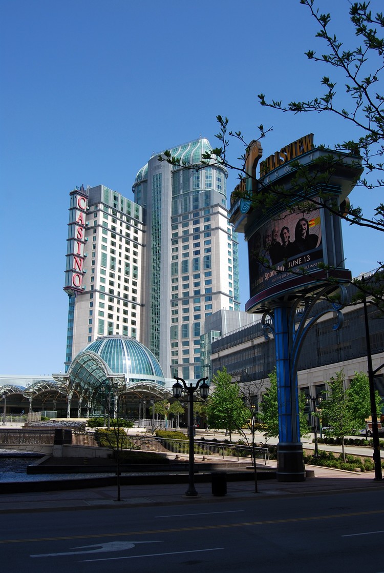 - View of the casino complex, twin glass and steel towers, a large red sign "Casino" runs vertically down the side of one tower ; large billboard advertising "Lovin' Spoonful" appearance at the casino on June 13 (2009) in forground right ; tree lined roadway leads up to entrance under the large glass dome (centre) ; Fallsview Boulevard in foreground ; taken 3:43 pm