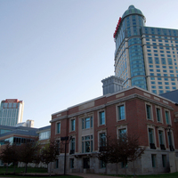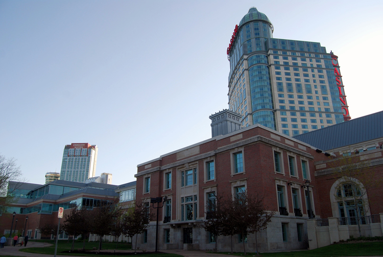 - The red brick building in the lower half of the photograph was once site of the transformer station building for the Ontario Power Company station at the foot of Horseshoe Falls built in 1904, it now serves as offices for the Casino ; the new part of the Casino is in the background to the right, a large steel and glass tower structure ; the word "Casino" in red runs vertically down the side of the tower ; the hotel tower to the left is the Embassy Suites Hotel ; taken 7:14 pm ;