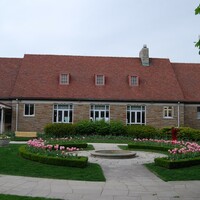 - The restaurant is a single story stone building with red tiled roof and dormer windows ; restaurant entrance to the left under the canopy ; a large circular flower bed is in front filled with pink tulips ; a flowering cherry tree to the right ; wooden benches aroun d the flower bed ; taken at 7:36 pm ;