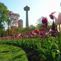 - Pink and purple tulips in flower beds in the foreground frame a distance view of Queen Victoria Park in the early morning ;Skylon Tower in background ; taken at 6:14 am ;