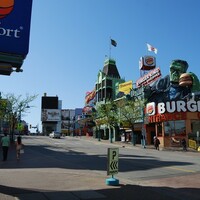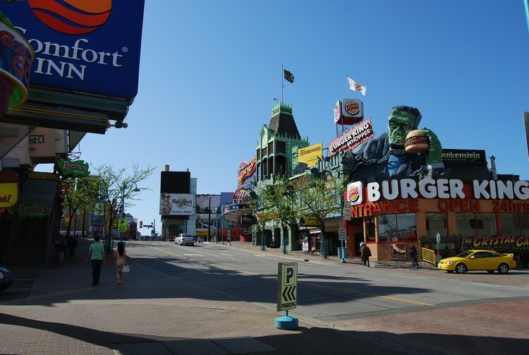 - The shot is taken from half way up Clifton Hill ; Left: large overhead sign advertising "Comfort Inn" in extreme foreground ; next green sign advertising "Rumours Night Club" ; in the extreme background on the corner of Victoria Avenue and Centre Street is a store facade with a sign advertising "Cuban Cigars" ; on the opposite side of the road is a large advertising billboard for the "Hard Rock Cafe" ; coming down the hill on the Right hand side ; Ripley's Moving Theatre, the House of Frankenstein ; entrance to Burger King ; bright yellow car centre right, possibly a Camaro or G6 ; taken 5:13 pm ;