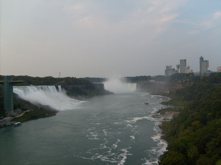 - en-CA Weather conditions in Niagara Falls when the photo was taken: Wind: south southwest, 22 km Temp: 23° C Cloudy Time: 8:32 a.m. This photo from Rainbow bridge, where concrete meets steel part of bridge.