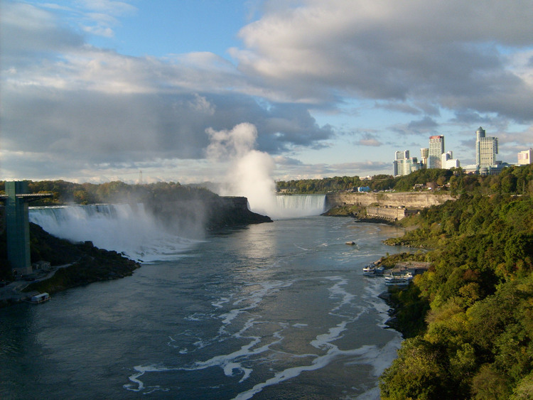 - en-CA Weather conditions in Niagara Falls when the photo was taken: Wind: north northwest, 12 km Temp: 8° C Scattered clouds Time: 8:33 a.m. This photo from Rainbow bridge, where concrete meets steel part of bridge.