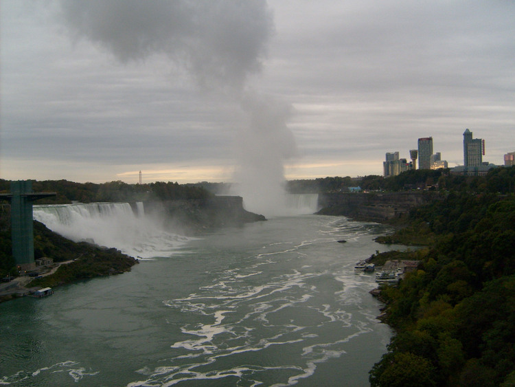 - en-CA Weather conditions in Niagara Falls when the photo was taken: Wind: calm Temp: 9° C Cloudy Time: 8:44 a.m. This photo from Rainbow bridge, where concrete meets steel part of bridge.